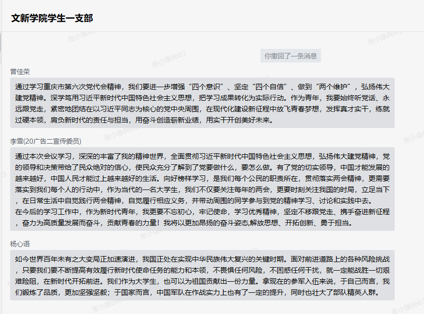 6月10日,学生一支部全体党员通过企业微信支部群深入学习重庆市第六次党代会精神,支部书记张小焕领学。