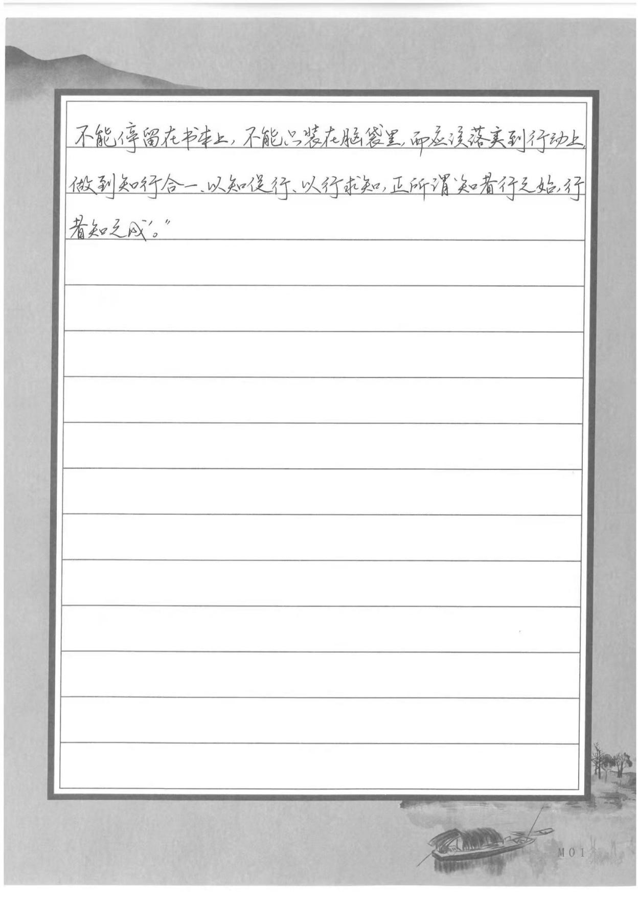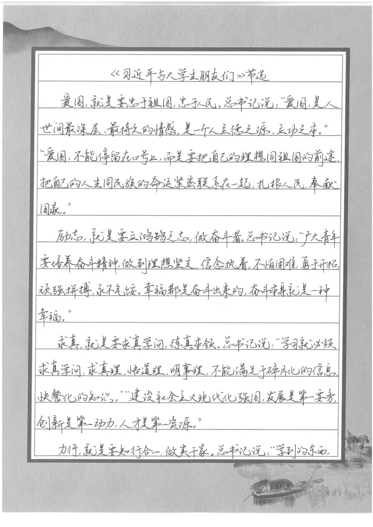 评:节选爱国、励志、求真、力行四个部分,用笔潇洒,流畅自然,给人雅逸之感,内容与结构展现知行合一。行书结体准确,笔法比较流畅,疏密得当。布局合理。