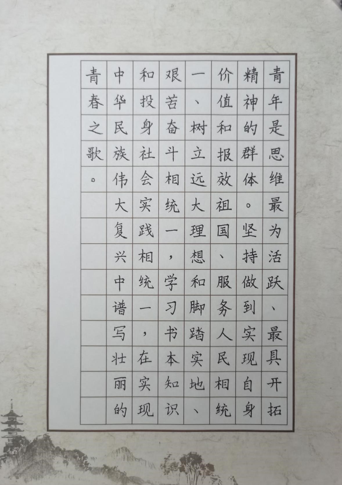评:下笔有力,字体美观,雄强俊秀,展现青年风华正茂之气。楷书间架精准,用笔圆润有力,有较好的粗细变化。整体美观。