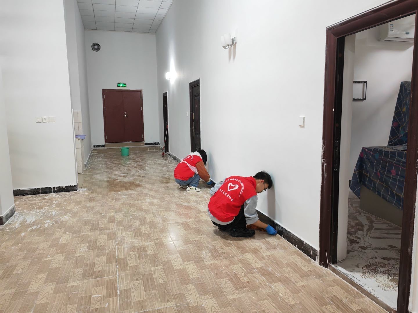 走进教室,基地老师给志愿者们讲解了阳光的成立历史,基地老师说道:“由于三年前洪水侵袭,基地房屋有所损坏,现在装修人员正在维修。”志愿者们听完后便热情投入其中,团结合作清扫地板上的墙灰,打扫洗手池,清理门板,擦拭地砖,为基地装修贡献一份力。活动结束,看着被打扫干净的教室志愿者们的心里成就感满满,并对以后的基地服务充满期待。