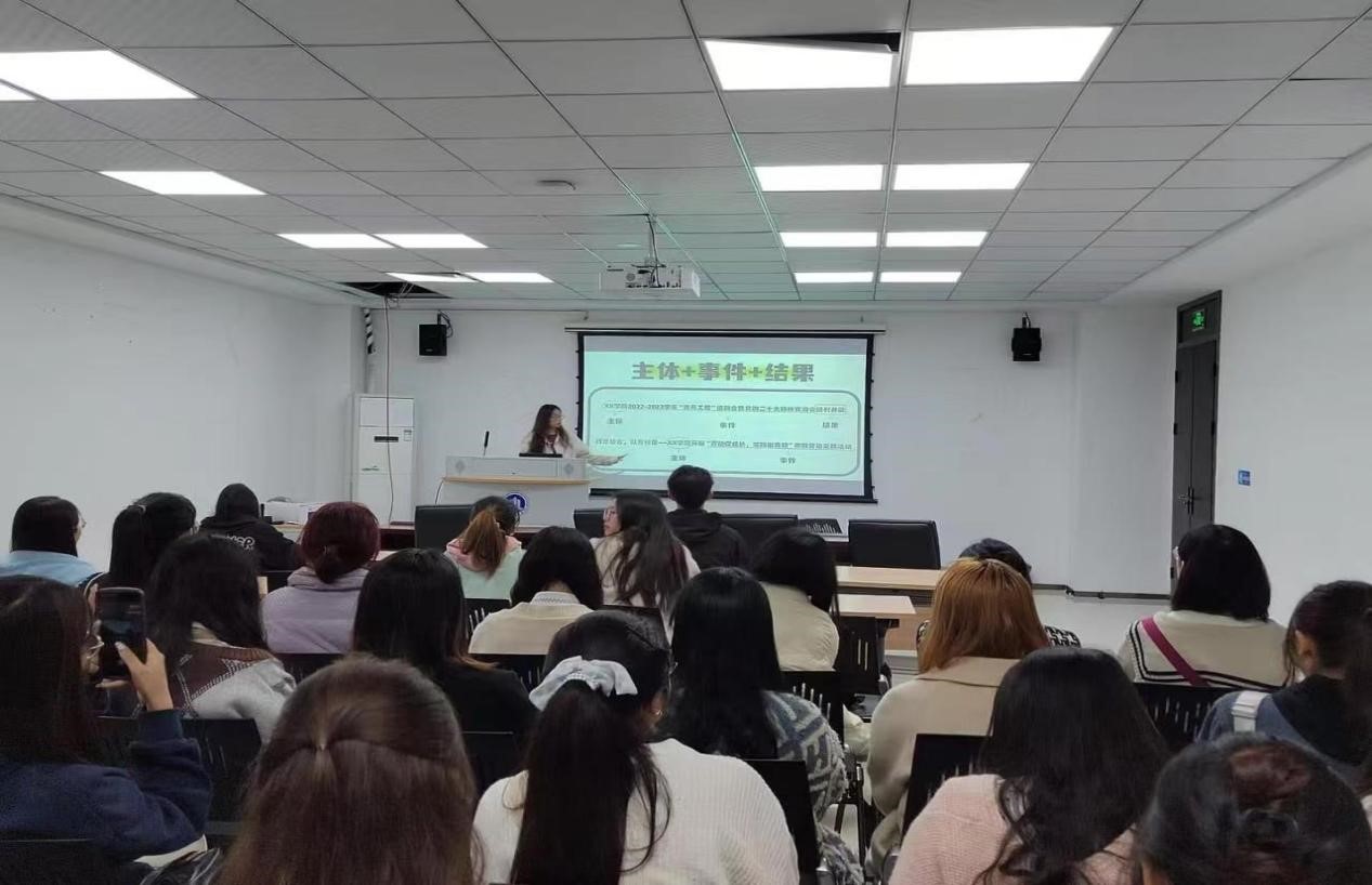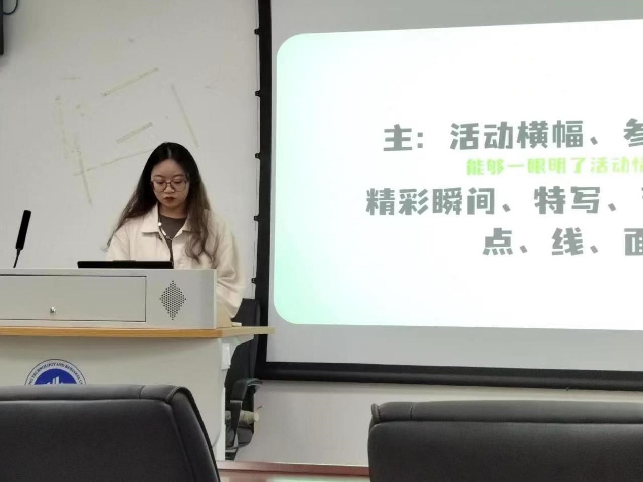 在培训会上,吕洁用四个板块为学弟学妹们讲解了“如何写好推文”这一工作技能。首先,她指出了新闻的基本结构。她从多个角度归纳总结了推文需要重视的方面:一是标题要抓眼球。从标题上下功夫,将读者感兴趣的点放在标题中;第二,文风要口语化,我们需要将文字变成大众喜闻乐见的形式,贴近受众;第三,内容具有真实性、架构要素齐全则是新闻的基本要求;第四,排版要有记忆点,篇幅要有舒适感,增加受众对该公众号的信任度满意度。随后,她讲解了图像拍摄和视频拍摄的要点:手要稳,拍摄的内容要清晰,便于同学们以后更好地去拍摄。最后,吕洁通过展示自己的作品让同学们更真切地感受到了新媒体的有趣。