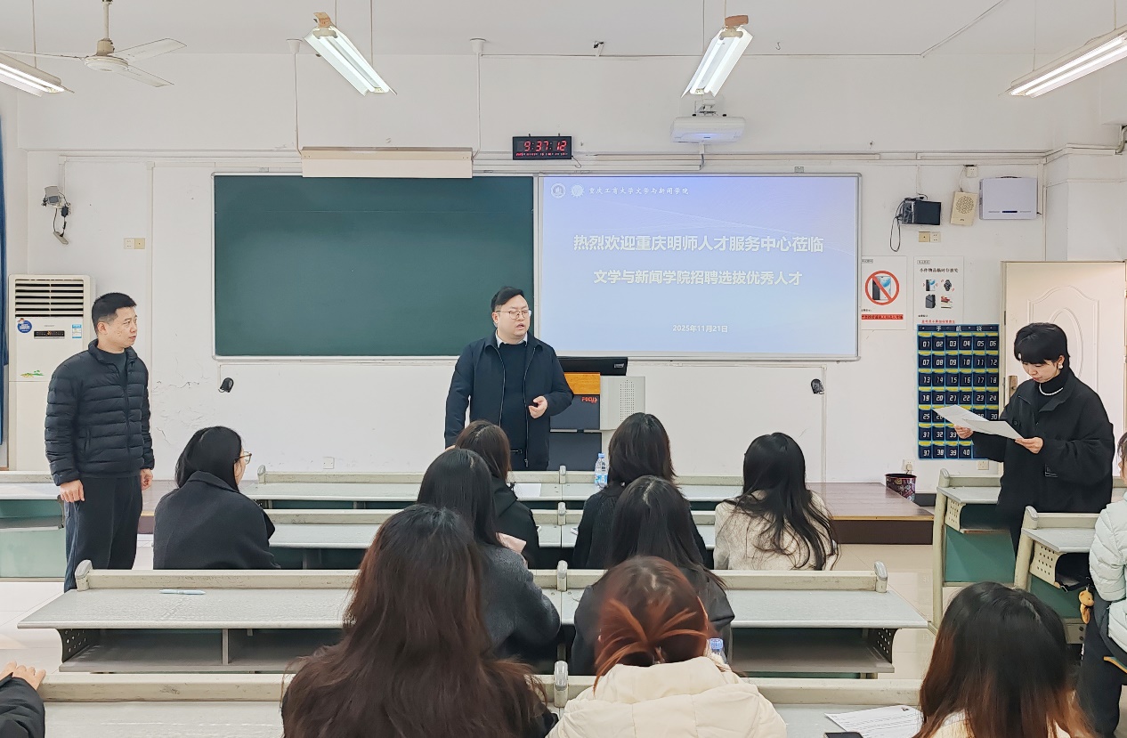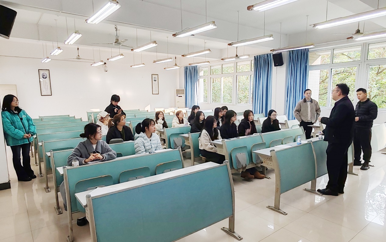 切实提升我院2026届毕业生的就业质量、满足广大非毕业年级学生的实习需要,11月21日上午,学院特邀重庆明师人才服务中心于慧智楼90625教室开展毕业生招聘宣讲会“招贤纳士”。重庆明师人才服务中心董事长潘桂明、人力资源部负责人符琦、学院2026届就业联络员李琦、毕业班辅导员周晋及本科生、硕士研究生参与。
