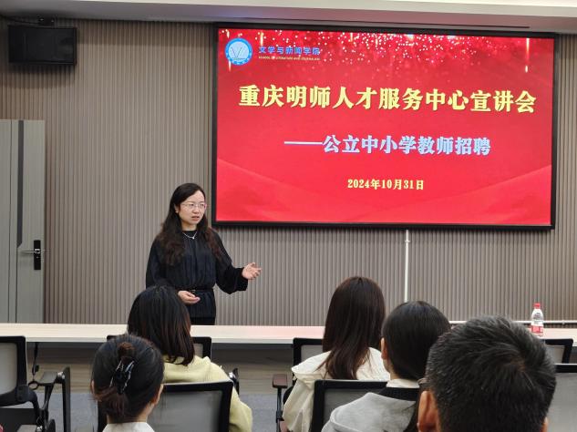 10月31日下午15时,重庆明师人才服务中心在慧智楼90529报告厅面向我校yl7703永利集团、数学与统计学院和外国语学院毕业生开展“公立中小学教师招聘”宣讲会,文新学院党委书记潘焱、重庆明师人才服务中心董事长潘桂明、总经理卢帅等出席。