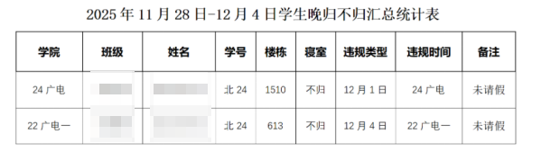 针对学院部分同学不请假彻夜不归或晚归情况,辅导员已第一时间与相关同学进行了解,知晓了同学不归、晚归的具体原因。学院现对上述不请假晚归不归同学进行通报,提醒其重视作息时间与安全要求,避免类似情况再次发生,希望以上受通报的同学严守校规校纪,合理安排学习、生活时间。