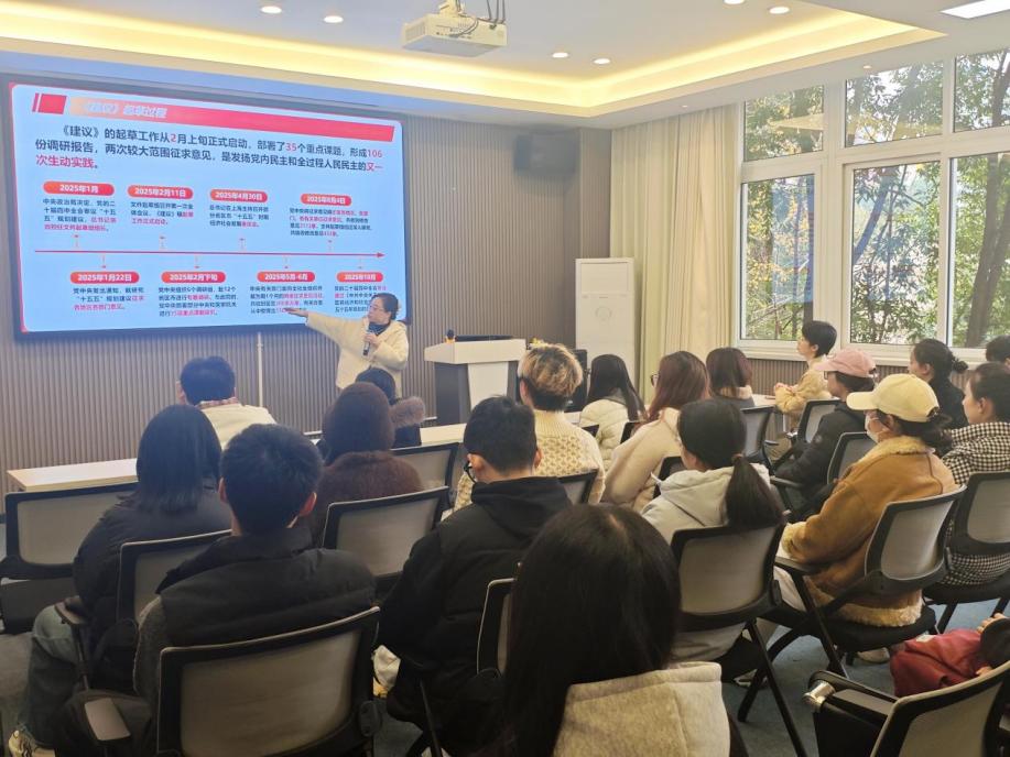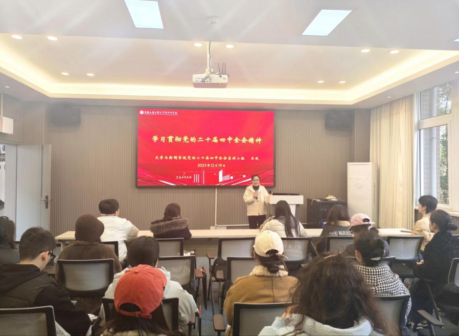 活动伊始,王欢以“学习贯彻党的二十届四中全会精神”为题开展专题宣讲。她围绕党的二十届四中全会的核心要义、实践要求,结合习近平总书记《因地制宜发展新质生产力》《推进党的自我革命要做到“五个进一步到位”》等重要文章精神,系统解读了全会精神对高等教育事业和研究生成长发展的指导意义。宣讲中,王欢结合学校发展实际和新闻传播学科特点,强调青年党员要立足专业所长,将全会精神与习近平总书记视察重庆重要讲话、重要指示精神结合起来,转化为推动学术研究、服务社会发展的实际行动,坚定拥护“两个确立”、坚决做到“两个维护”。