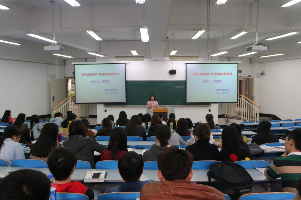 ,yl7703永利集团举办“学习先进经验,感受榜样力量”的主题宣讲会,活动邀请我校首届校长荣誉奖学金获得者2011级广电1班季阳芷同学作主题宣讲。学院党总支副书记李华平、13级辅导员肖婷老师、