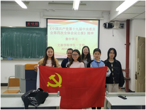 11月1日下午,学生一支部在慧智楼90201教室开展“不忘初心、牢记使命”政治理论学习活动,活动内容是学习习近平总书记在党的十九届四中全会上的重要讲话和全会精神。