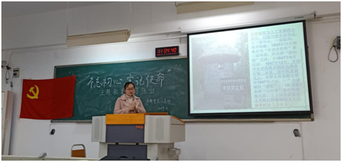 殷老师此次主要讲解了红岩精神。首先,介绍了重庆的白公馆和渣滓洞的红色历史;其次讲解了关于红岩精神相关的诗歌和书籍《囚歌》、《我的自白书》和《红岩》,表现革命者的伟大气节,为革命献身的壮志豪情;再通过《红梅赞》这样一首歌,表现了江姐的凄美故事,什么是红岩革命精神:“爱国、奋斗、团结、奉献”的革命精神;最后通过之前支部参观红岩陈列馆一些图片来回顾历史的场景和画面,让同学们走进红色景点,更加深刻的感受红岩精神。