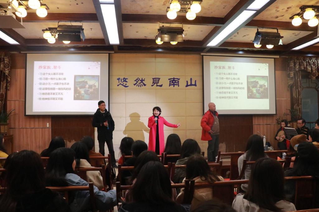 讲座伊始,伴着咚咙咚咙的锣鼓声,一场打击乐小开门为在场观众直观的展现了京剧的“场面”,薛新力教授亲切的用浅显易懂的话语从原始歌舞、先秦古巫,到宋元戏曲、杂剧,明清传奇向戏剧爱好者们介绍了中国古代戏剧的变迁;通过师生《牡丹亭游园》、《空城计》、《贵妃醉酒》、《锁麟囊》、《西厢记》、《锁麟囊》、《西厢记》、《打龙袍》片段现场演绎,对大众耳熟能详的京剧五大行当“生”、“旦”、“净”、“末”、“丑”进行了详细介绍;通过京剧视频对京剧“唱”、“念”、“做”、“打”四功进行了形象化的演绎。