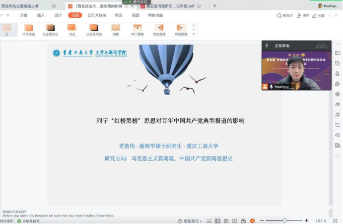 贾浩伟作了题为《列宁“红榜黑榜”思想对百年中国共产党典型报道的影响》的发言,对中国共产党新闻工作中的典型报道进行了溯源与探析。会后得到西安交通大学新闻与新媒体学院院长、教授李明德与中央民族大学新闻传播学院特聘院长、华中科技大学教授张昆的评议,并在最后的颁奖典礼中荣获第五届“何微新闻奖”三等奖。