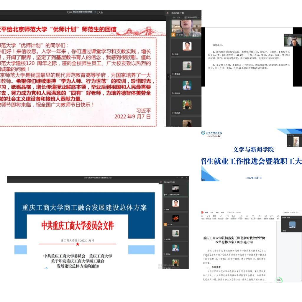 在教职工大会上,于频围绕“习近平给北京师范大学‘优师计划’师范生的回信”、“学习《习近平致中国新闻社建设70周年的贺信》”等内容,领学了10月份教职工政治理论学习。王仕勇领学了《重庆工商大学商工融合发展建设总体方案》《重庆工商大学分类发展建设方案》,并传达了学校本科教育教学审核评估动员会会议精神,对学院迎接本科教育教学审核评估相关内容进行了强调。党委副书记程元元通报了学生思想动态、近期疫情防控形势和网络诈骗情况。副院长邓伟传达了学校两金会议精神,并就教职工2023年国家社科基金申报进行了动员。副院长郑笑眉领学重庆工商大学《深化新时代教育评价改革总体方案》实施方案。