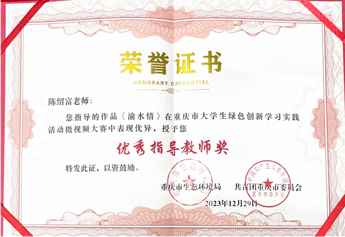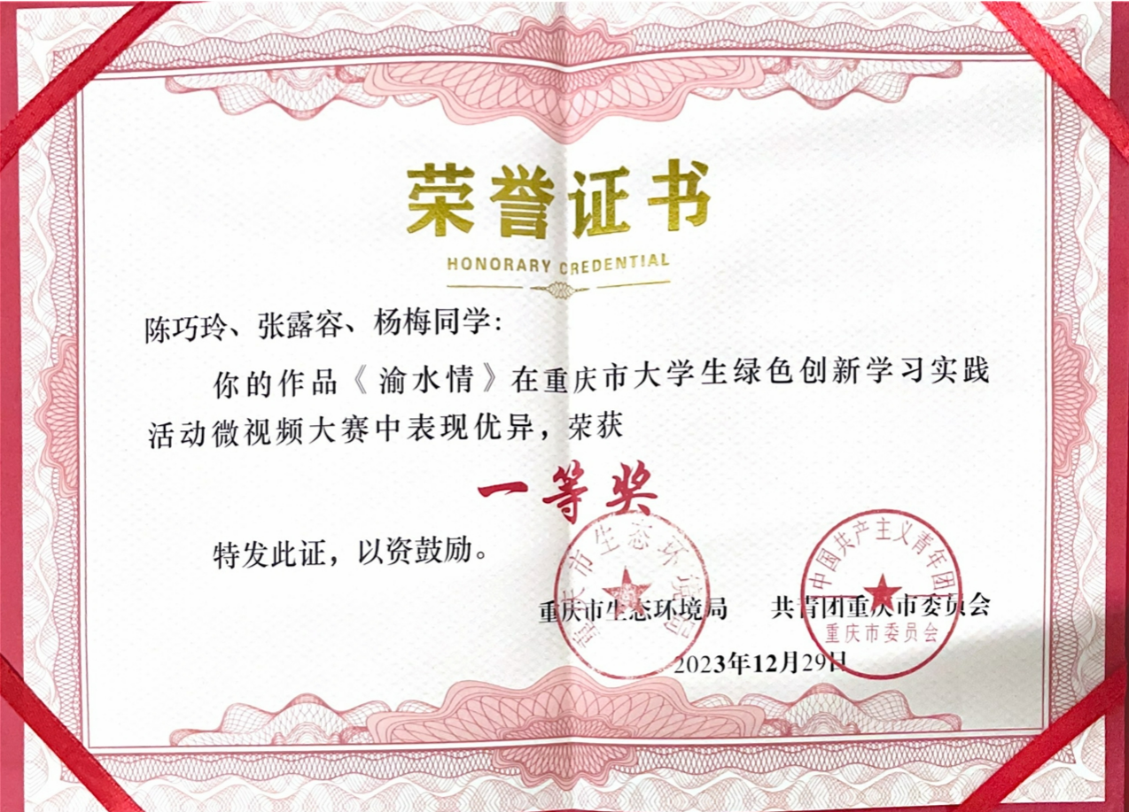 近日,重庆市大学生绿色创新学习实践活动微视频大赛传来喜讯,yl7703永利集团学生陈巧玲、杨梅、张露容在陈绍富老师指导下创作完成的短视频《渝水情》荣获大赛一等奖。