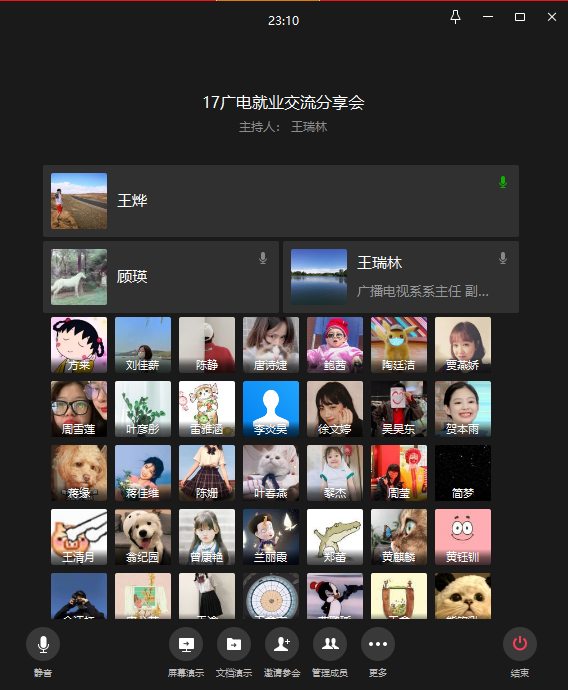 为推动毕业生就业工作,帮助同学们总结就业过程中的经验和教训,4月14日晚7点30分,面向2017级广播电视学专业全体同学的就业交流分享会在企业微信平台顺利举行。本次分享会以线上直播的方式进行,旨在通过专业教师及学生的经验分享帮助毕业生更好地就业。会议由广播电视学系系主任王瑞林老师主持,广播电视学的9名专业教师和2017级全体学生参加了本次会议。