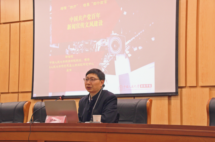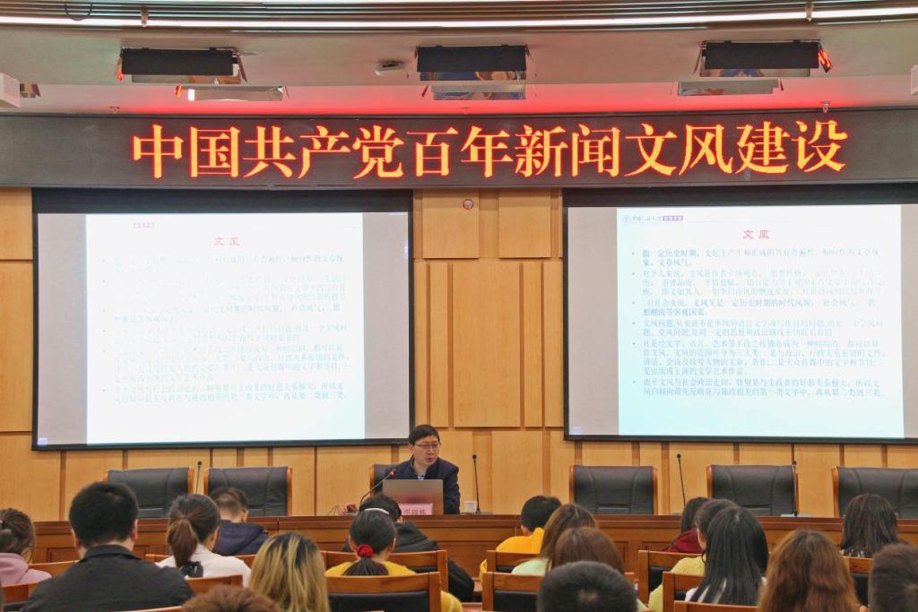 讲座中,邓绍根教授以“文风”为切入点,回顾了毛泽东时代的“学风和文风都是党风”,并将习近平总书记提出的“文风不是小事,文风连着学风,体现出党风”两者结合起来,阐释了中国共产党在建党近百年历史中曾面临的新闻文风问题以及解决方法。