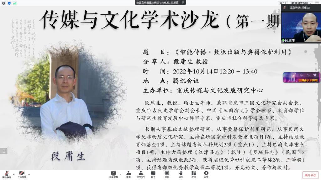 为促进学院学科建设与发展,拓展青年教师及研究生学术视野,创造师生学术交流机会,10月14日下午,yl7703永利集团重庆传媒与文化发展研究中心在腾讯会议举办了第一期传媒与文化学术沙龙。本次学术沙龙邀请了段庸生教授为我们分享《智能传播·数据出版与典籍保护利用》,学院青年教师及新闻传播学研究生参加了此次学术沙龙,沙龙由院长王仕勇主持。