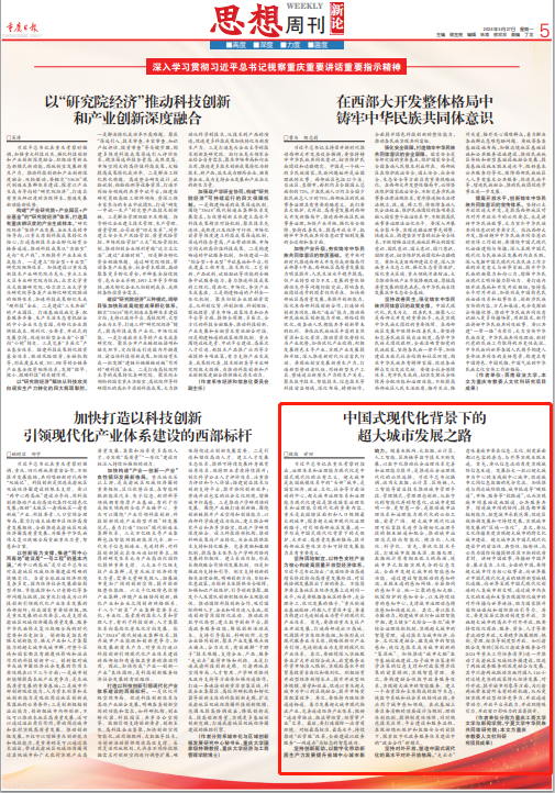 5月27日,《重庆日报》思想周刊刊登了我院院长殷俊教授撰写的题为《中国式现代化背景下的超大城市发展之路》的理论文章。