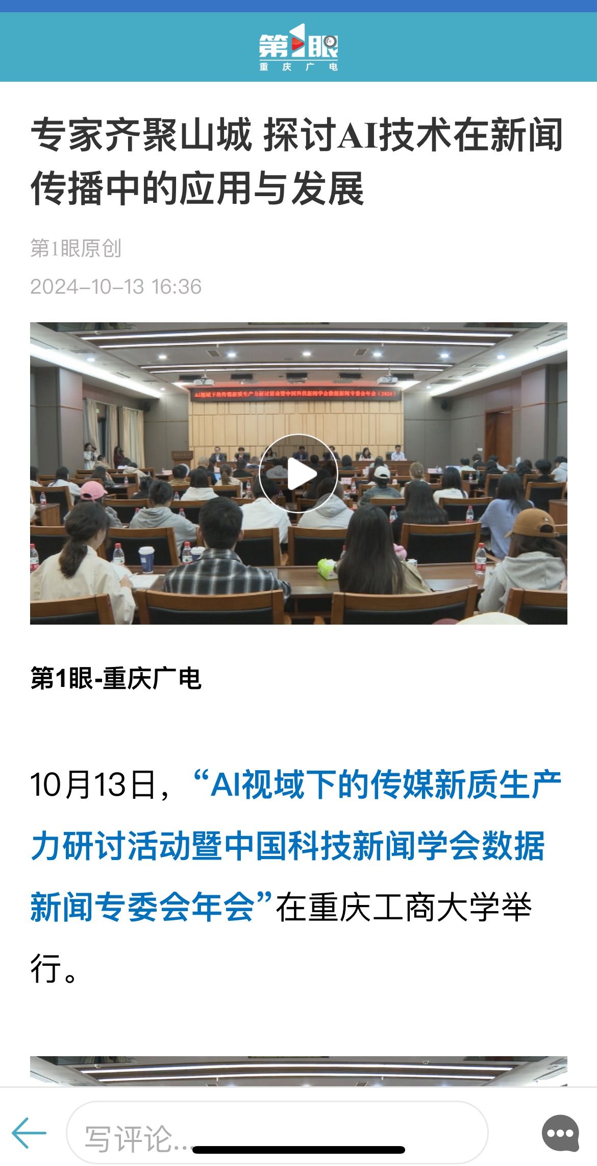 近日,人民网以《传媒行业在AI视域下如何发掘新质生产力?这场研讨活动紧扣前沿趋势》为题;科学网以《人工智能技术对传媒行业有何影响?专家学者这样说》;重庆电视台以《专家齐聚山城 探讨AI技术在新闻传播中的应用与发展》;华龙网以《传媒行业在AI视域下如何发掘新质生产力?这场研讨活动紧扣前沿趋势》为题;上游新闻以《人工智能技术如何影响传媒行业?他们这样说》为题;光明网以《中国科技新闻学会数据新闻专委会年会在重庆举行》为题;人民政协报以《“AI视域下的传媒新质生产力研讨活动暨中国科技新闻学会数据新闻专委会年会”在重庆举行》为题分别报道了10月13日我校召的“AI视域下的传媒新质生产力研讨活动暨中国科技新闻学会数据新闻专委会年会”。