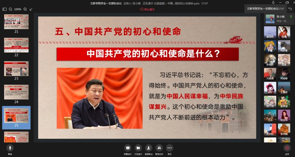 4月30日,文新学院学生一支部全体党员通过企业微信开展“重温百年党史 传承红色基因”党史学习教育活动,支部书记张小焕老师为支部党员讲授了《红船起航:中国共产党的初心和使命》专题党课。