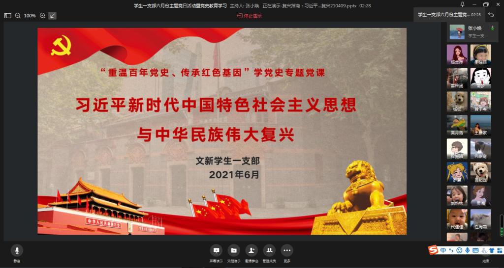 为迎接党的百年华诞,培养同学们成为有理想有抱负、勇于担当责任的青年,学生一支部于6月30日晚通过企业微信支部群进行了“重温百年党史 传承红色基因”专题党课,此次党课由支部书记张小焕老师讲授。