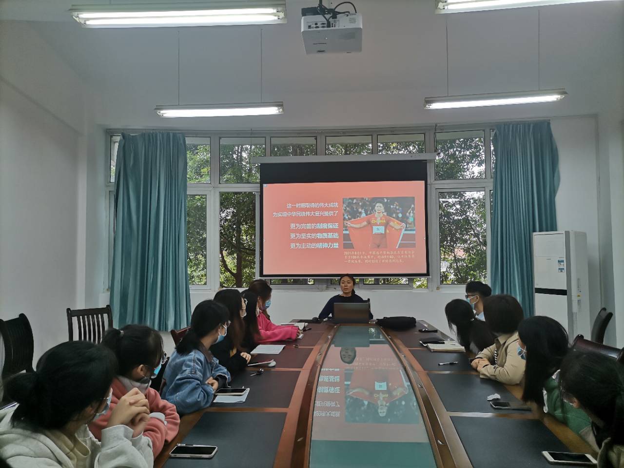 接着,肖婷老师就我国运动员苏炳添在东京奥运会打破亚洲记录的事迹,深刻剖析了这一成就背后的意义,明确了这一成就的背后离不开完善的制度保证、坚实的物质基础、主动的精神力量,同时鼓励同学们学习其顽强拼搏、不抛弃不放弃的精神。精神血脉,代代相传。