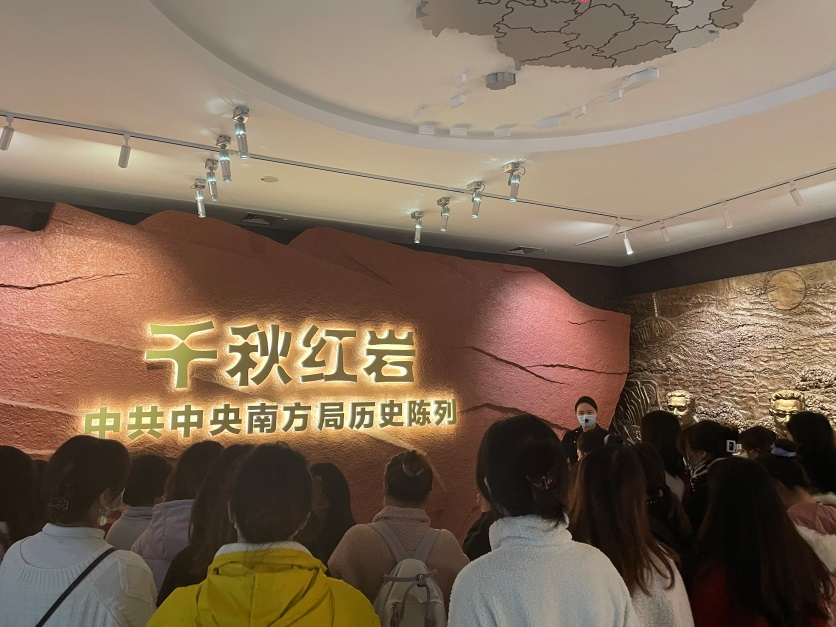 下午14:00,学员们乘车来到了红岩革命纪念馆教学区,在讲解员的带领下前往大厅一楼进行新发展党员宣誓。之后前往三楼观看红岩记忆数字体验厅,学员们通过VR全息媒体观看了《愈炸愈强》—重庆大轰炸期间的渝中半岛场景。影片表现了重庆人民奋勇反抗,自强不息的精神风貌。结束观看后,学员们一同前往一楼参观学习“千秋红岩”专题展览。红岩革命纪念馆中收藏了革命时期诸多文物,在学习过程中,革命志士的人物照片、会议书稿和各个专题板映入大家眼帘,学员们还看到了周总理及其夫人在重庆工作所穿的服饰和毛主席抵达重庆机场的蜡像。讲解员为大家细致的介绍了每个展区背后的深层故事,学员们不仅被烈士们战时深厚的革命友谊所感动,也被革命志士热爱党、忠于党的初心而打动。