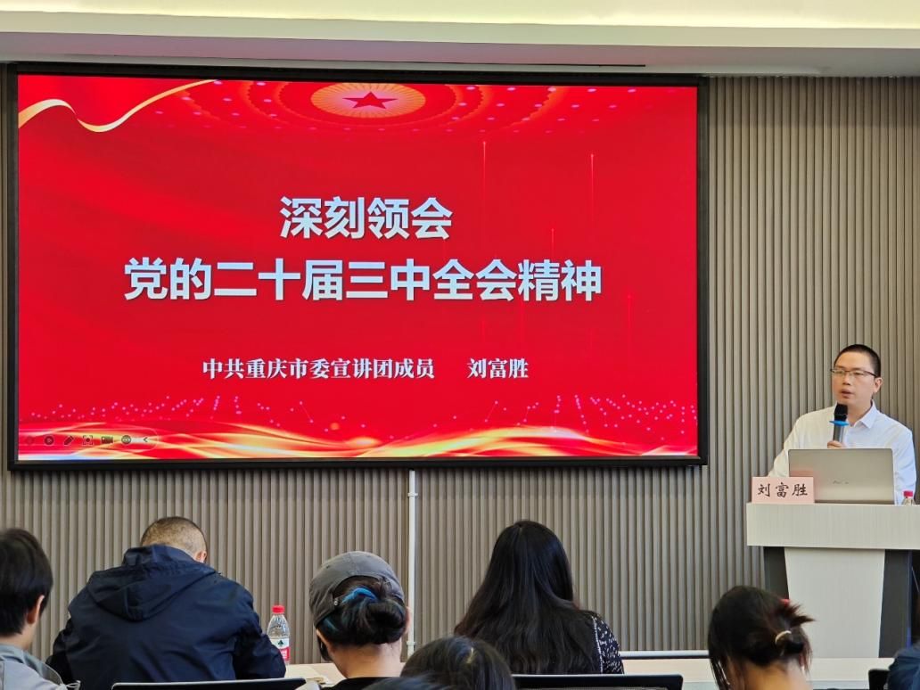 10月15日,中共重庆市委宣讲团成员、马克思主义学院党委副书记、院长刘富胜教授在慧智楼90529学术厅作学习贯彻党的二十届三中全会精神宣讲报告。yl7703永利集团师生党员代表、入党积极分子代表以及公共管理学院师生代表共计50余人到会聆听了宣讲。宣讲会由yl7703永利集团党委副书记程元元主持。
