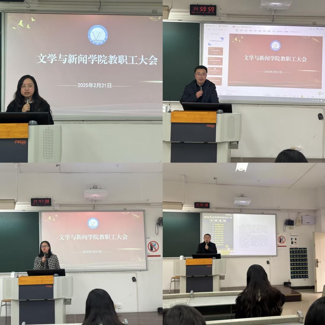 会议第二阶段,学校领导班子就新学期重点工作进行安排部署。副院长郑笑眉安排开学教学工作,纪委书记程元元开展以案四说警示教育宣传活动,院长殷俊布置新学期教学科研相关工作、强调部校共建新闻学院和申博工作;党委书记潘焱强调了开学重点任务,宣传部署了学院本科生五合一导师工作。