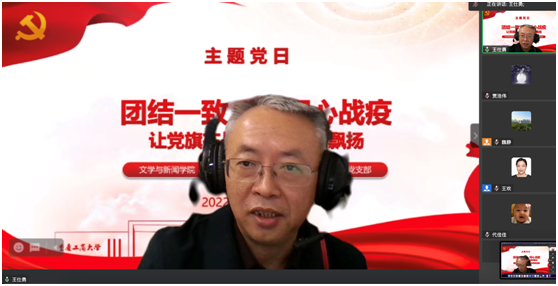 王仕勇院长发言指出研究生支部党员拥有双重身份,既要为本科学生做好学业的引领带头作用,又要发挥党员的先锋模范作用。他为老师和同学们点赞,并表示抗疫与教学科研工作并不冲突,线上教学与科研要同步进行。为了充实丰富同学们的生活,学生党员要组织参与各种兴趣活动,让同学们在枯燥乏味的生活中感受到温情满满。他期待全体党员干部共同努力,为迎来正常的教学生活做准备。