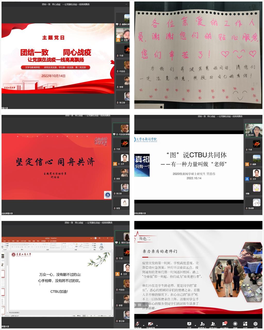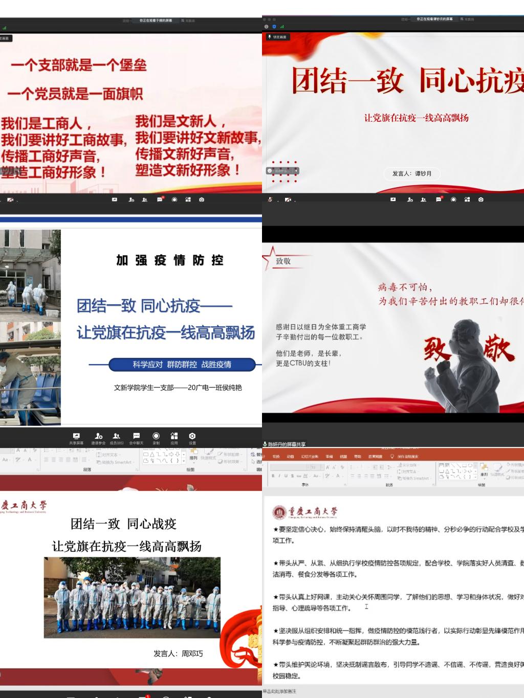学生一支部学生党员李沿蒙、代佳佳、侯纯艳,学生二支部周邓巧、谭钞月、唐文韬分别结合自己的抗疫经历,分享了集中隔离后倍受关怀的隔离生活、校园疫情防控的每日进展、学生对学院老师们的感恩之情等。他们感怀学院的领导和老师们如同大家长一般,对学生们给予了无微不至的关怀,他们尽力做好疫情防控的组织者、学生生活的陪伴者、青年思想的引领者,与学生们一起并肩作战、众志成城抗击疫情。