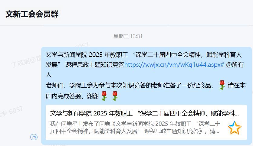 此次知识竞答活动是文新学院工会深化理论学习、凝聚思想共识的重要举措。通过以赛促学、以学促干的形式,不仅帮助全院教职工进一步明晰了二十届四中全会的战略部署和实践要求,更增强了大家立足教育岗位、担当育人使命的责任感与使命感。未来,学院工会将继续聚焦思想政治引领,创新学习形式、丰富活动载体,推动理论学习与学院发展深度融合,为推进中国式现代化宏伟事业、助力学校和学院高质量发展凝聚更强合力。