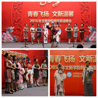 师生联谊晚会上,节目精彩纷呈,气氛热烈,高潮迭起。学院教师及学生代表精心编排了古装走秀表演、戏剧联唱、古筝书法合奏、爱国朗诵等节目,为观众献上了一场视听盛宴。节目中穿插的你来比划我来猜、词语接龙、随机抽奖等互动游戏,将晚会推向一个又一个高潮。晚会最后,一曲《难忘今宵》唱出了所有文新人的心声。