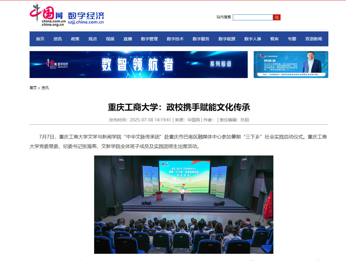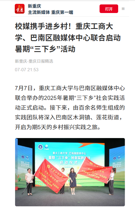 中国网以《重庆工商大学:政校携手赋能文化传承》、新重庆-重庆日报以《校媒携手进乡村!重庆工商大学、巴南区融媒体中心联合启动暑期“三下乡”活动》为题对此活动进行报道。