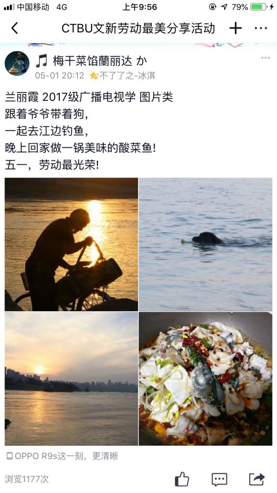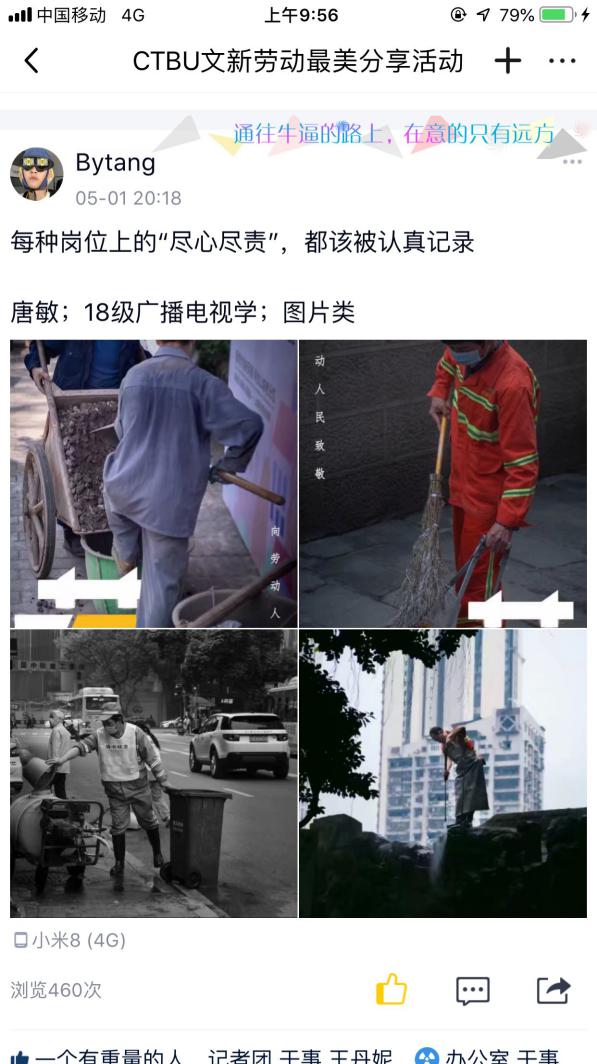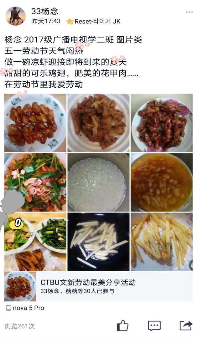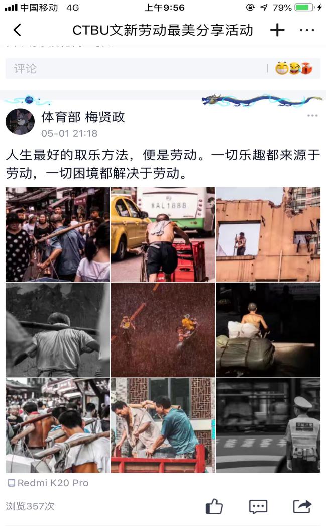因疫情滞留在家无法返校的杨念同学,借此机会开始学起了做饭,杨念同学在活动主题中晒出了自己在厨房做饭和出锅的食物的照片,并且在分享做菜经验的时候特意强调做红烧肉的时候“一定要多放一点白糖,这样做出来的味道才够鲜美”,这样有趣的劳动分享获得同学们关注点赞。来自17级梅贤政同学则是分享了一组的自己的摄影作品,作品的内容是正在工作中的“棒棒军们”,谈到拍摄过程梅同学说:“我走在街上看着棒棒在烈日下扛着沉重的货物我在那一霎那感受到了劳动人民的力量,所以我用相机记录下了这一刻。”在分享这一组精美的照片时,梅贤政同学用文字抒发了自己对劳动的深刻感悟:“一切乐趣都来源于劳动,一切困境都解决于劳动。”