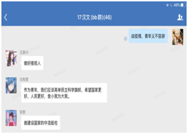 本次团日活动主题以年级为单位,共22个支部积极参与,各支部充分利用网络平台竭力展示了新一代青年团员的活力与创新力,形式多样,内容丰富,创意十足,既有线上理论宣讲,企业微信直播、观看视频以及支部团员感悟分享,又有同学们居家为庆祝五四的到来所创作的手抄报、海报、诗歌等,竭力展示了各支部成员的青年担当与精神面貌。如18新媒体一支部,通过企业微信,充分利用自己所学的专业知识,制作了以“青春告白祖国”为主题的海报、剪辑了相关视频并同步分享创作的灵感,那首背景音乐《我爱你,中国》是全体团员内心的独白,那句“我要把美好的青春献给你,我的母亲,我的祖国”唱出了所有团员告白祖国的心声。又如17汉文支部采用ppt展示以及观看视频等形式坚定制度自信,再现了五四时期代表人物的经典独白,视频中那一幕幕“一方有难,八方支援”的抗疫画面深深触动了团员们的内心,坚定而执着的信念鼓舞了不少同学,让同学们受益匪浅,进一步加深了青年团员们对于责任和担当的理解,更加坚定了为实现中华民族伟大复兴中国梦艰苦奋斗的决心。