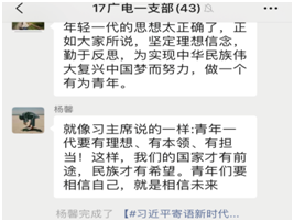 学院五四主题团日活动大力弘扬了新时代爱国主义精神,强化了大学生作为当代青年的历史使命,不少团员表示将以更高的标准严格要求自己,练就过硬本领,发愤图强,为祖国的繁荣富强贡献自己的青春力量。