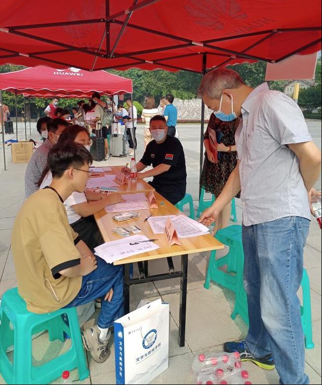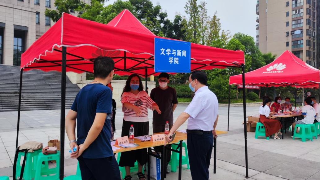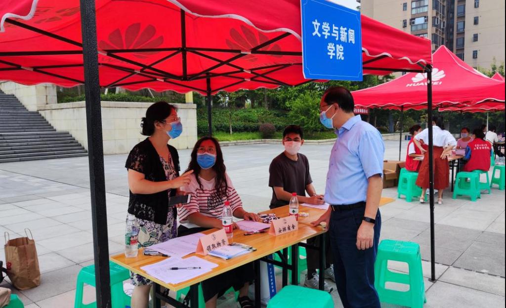 9月18日上午,学校党委常委、副校长张波和研究生院副院长邓龙奎、党委研工部徐阔一行先后来到现场视察指导迎新工作,认真询问和了解学院的相关工作安排,他们充分肯定了我院周密细微的准备工作,并嘱咐学院相关负责人保持疫情防控意识不放松,继续为新生提供更安全、更便捷的入学服务。同时,文新学院也高度重视这次迎新工作,学院党委书记于频到现场参与迎新工作,并亲切地慰问了迎新现场的老师和志愿者,详细询问了新生报到情况,与前来报到的新生热情交谈。