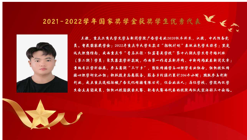王澈,重庆工商大学yl7703永利集团广告学专业2020级本科生,汉族,中共预备党员。曾获国家奖学金;2022年重庆市大学生实习“扬帆计划”表现出色学生;坚定远大理想信念,成为重庆市“青马工程·红岩菁英学校”第十六期大学生骨干培训班(第二期)学员;聚焦落实学科实践,作为第一作者在新华网、中新网发表新闻文章;专注学科拓展,前往忠县磨子乡参与暑期“三下乡”,前往重庆市文化和旅游发展委员会参与专业实习,围绕传播学与心理学专业组合,组织传播心理学研究小组;积极投身志愿服务,服务乡村振兴累计206小时;踊跃参与创新创业,成立重庆通屿际域广告文化传播有限公司,任企业法人;历任学校、学院两级学生会主席团成员,组织以校园提案大赛、配音大赛为代表的校院两级大型活动三十余场。