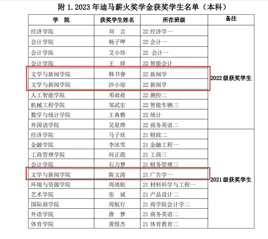 依据《重庆工商大学“迪马·薪火”奖学金评选办法》,经学生个人申请、各学院推荐申报、学生处审核、“迪马·薪火”奖学金考评小组面试评审,最终评选出20名本科学生和10名研究生荣获2023年“迪马·薪火”奖学金。其中,我院22级新闻学本科生韩书睿、沙小琼,21广告学本科生陈文涛,以及21级新闻学研究生徐雪梅荣获此次奖学金。