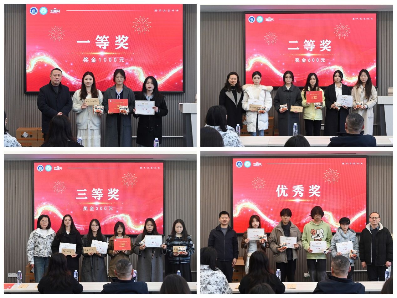 最后,程元元在颁奖典礼总结讲话中指出,本次大赛通过深化校企合作,构建起“创新实践+市场接轨”的育人模式。他强调学生创作需兼具艺术创新与市场价值,以群众喜闻乐见的形式讲好文化故事。同时,现场转达了重庆“渝城”五味风重庆小面店负责人毛开兵老师对获奖团队的祝贺。校企双方表示将持续深化合作,通过拓展实践平台、优化培养机制等方式,为青年学子提供更广阔的专业成长空间。