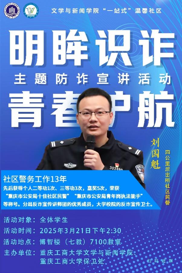 为积极响应国家关于加强网络安全教育的号召,进一步加强反诈宣传力度,切实增强学生识骗防骗的意识和能力。3月21日,由学工部、保卫处和yl7703永利集团联合主办的“明眸识诈,青春护航”防诈主题讲座在博智楼7100报告厅顺利举行。活动特邀四公里派出所民警刘国魁作为主讲人,学工部副部长杨徐勇到场指导。文新学院党委副书记程元元,学工办周晋、李琦、张波及“一站式”温馨社区百余名学生聆听宣讲。