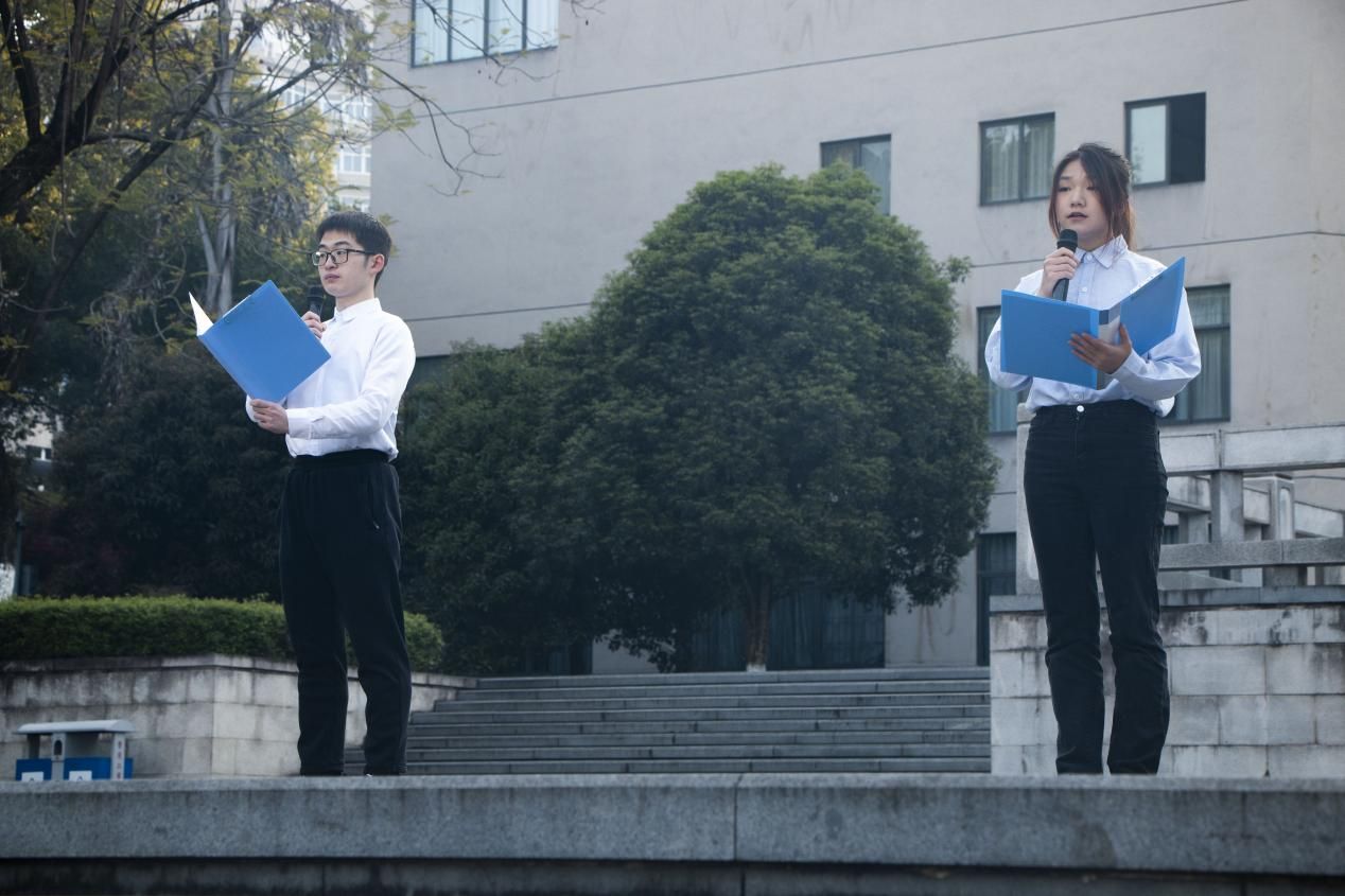 在诗朗诵环节,谢雨荷同学与欧阳南北同学以铿锵之声朗诵《青春征途,与国同行》,着重彰显新时代学子的使命自觉:“既要做破晓时分的追光者,传承文明薪火;更要做连接世界的筑桥人,传递中国声音。”