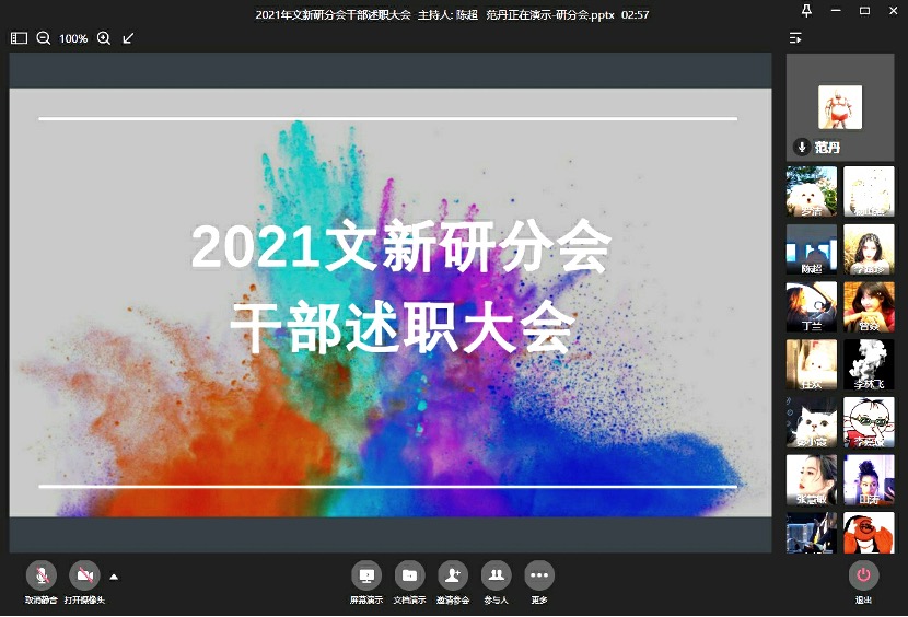 2021年10月8日晚,为进一步提高研分会干部工作能力,确切落实本学期工作计划,在做好疫情防控工作的基础上,我院研分会召开线上2021—2022学年上半学期干部述职评议大会。此次干部述职大会由研分会副主席范丹主持,文新学院研究生支部书记、研究生班主任唐玉星老师和研分会全体成员共同参与倾听和学习。