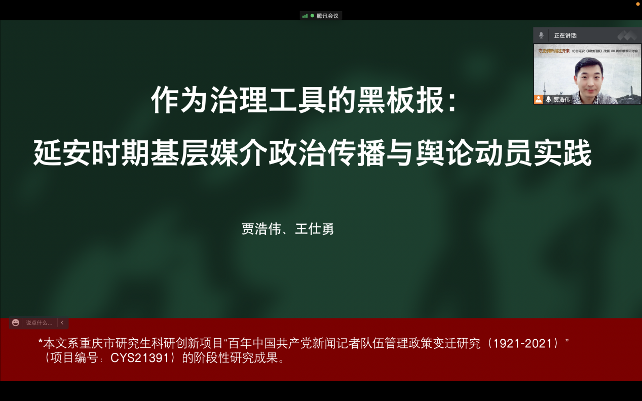 本次研讨会的主题为“守正创新 继往开来”。贾浩伟作了题为《作为治理工具的黑板报:延安时期基层媒介政治传播与舆论动员实践》的发言,对中国共产党在延安时期大众黑板报的政治传播和舆论动员实践做了分析,并结合如今的乡村振兴战略,对新闻媒介参与社会治理以及乡村传播的相关议题进行了思考交流。会后得到南京大学新闻传播学院教授丁柏铨、复旦大学新闻学院教授陈建云的评议。