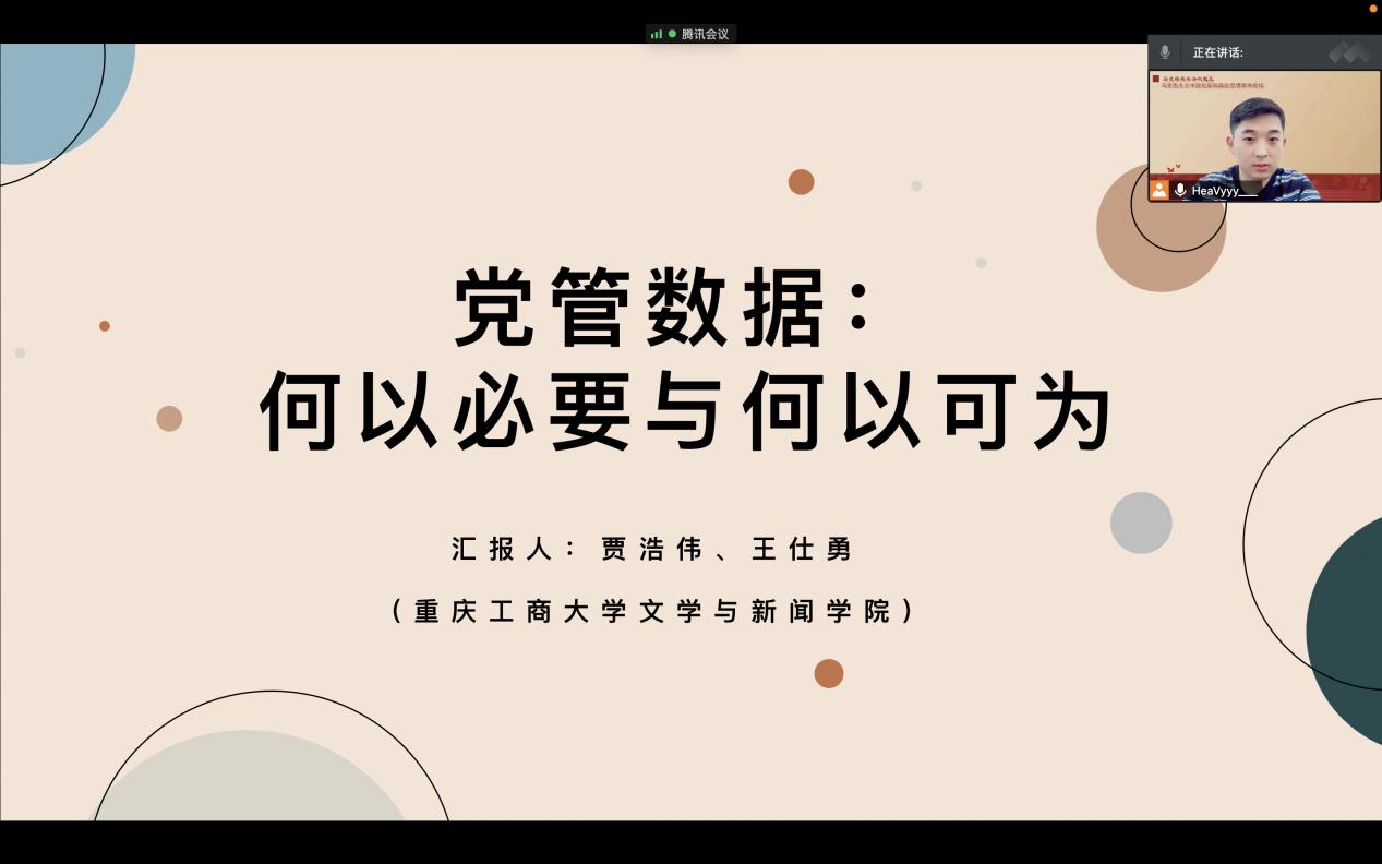 此分论坛的主题为“中国共产党新闻舆论工作多元发展”,贾浩伟作了题为《党管数据:何以必要与何以可为》的发言,以史论结合的方式回溯中国共产党对互联网新媒体技术的政策规训历程。会后得到中国人民大学副教授王亦高、中国人民大学讲师杨奇光的评议。