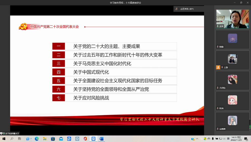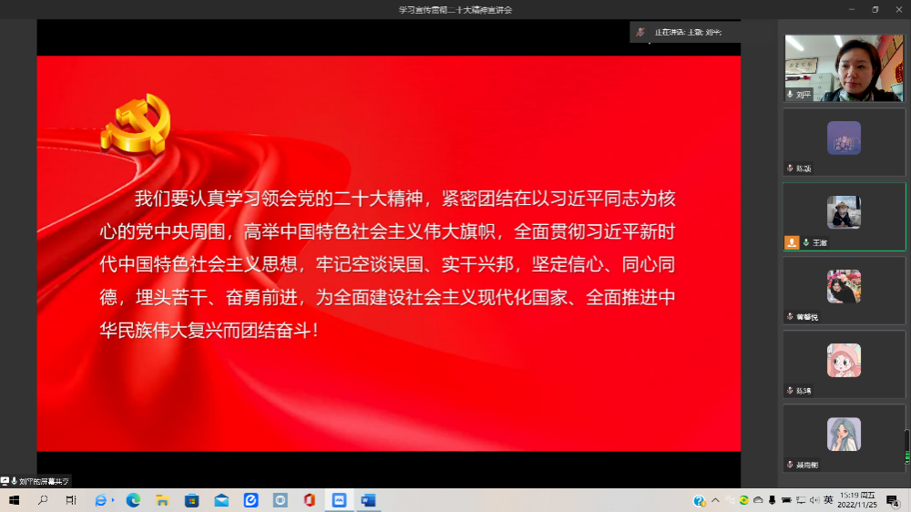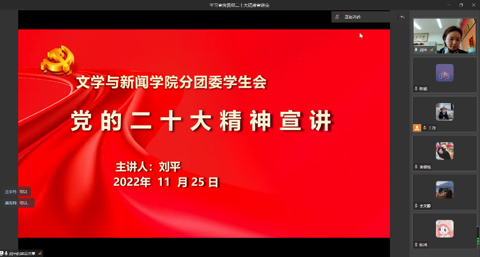 为认真学习宣传贯彻党的二十大精神,引导学生准确把握党的二十大精神核心要义。11月25日下午14时30分,yl7703永利集团分团委学生会组织开展线上“学习贯彻二十大精神宣讲会”活动,分团委学生会全体成员参加,分团委书记刘平为主讲人。