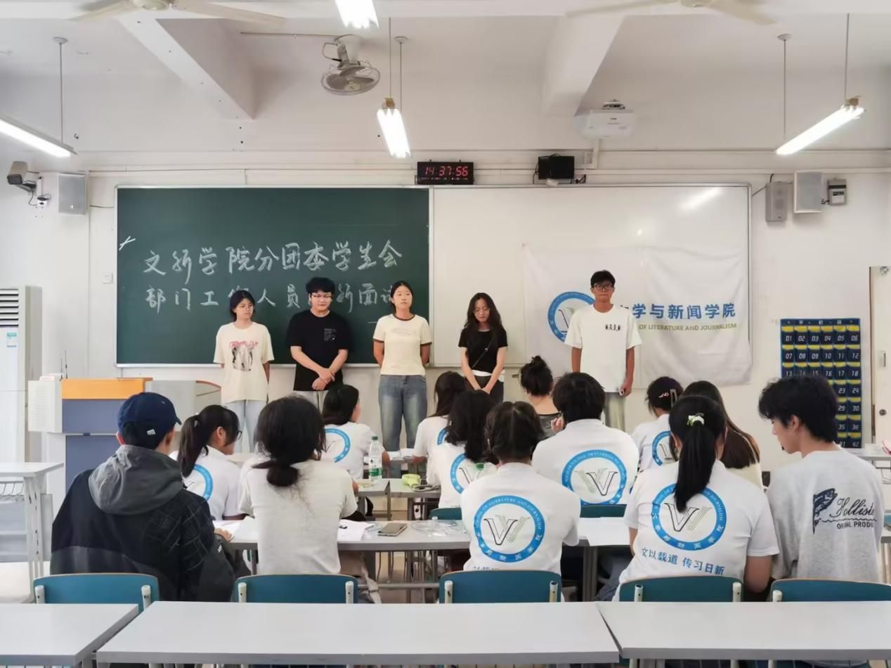 在同学们对各部门的工作情况有所了解的基础上,9月22日下午学院分团委学生会主席团成员、各部门负责人代表共23人在江北校区B506教室进行现场招新面试。新媒体工作室与“文小青”青年志愿者服务队在企业微信上进行线上面试。