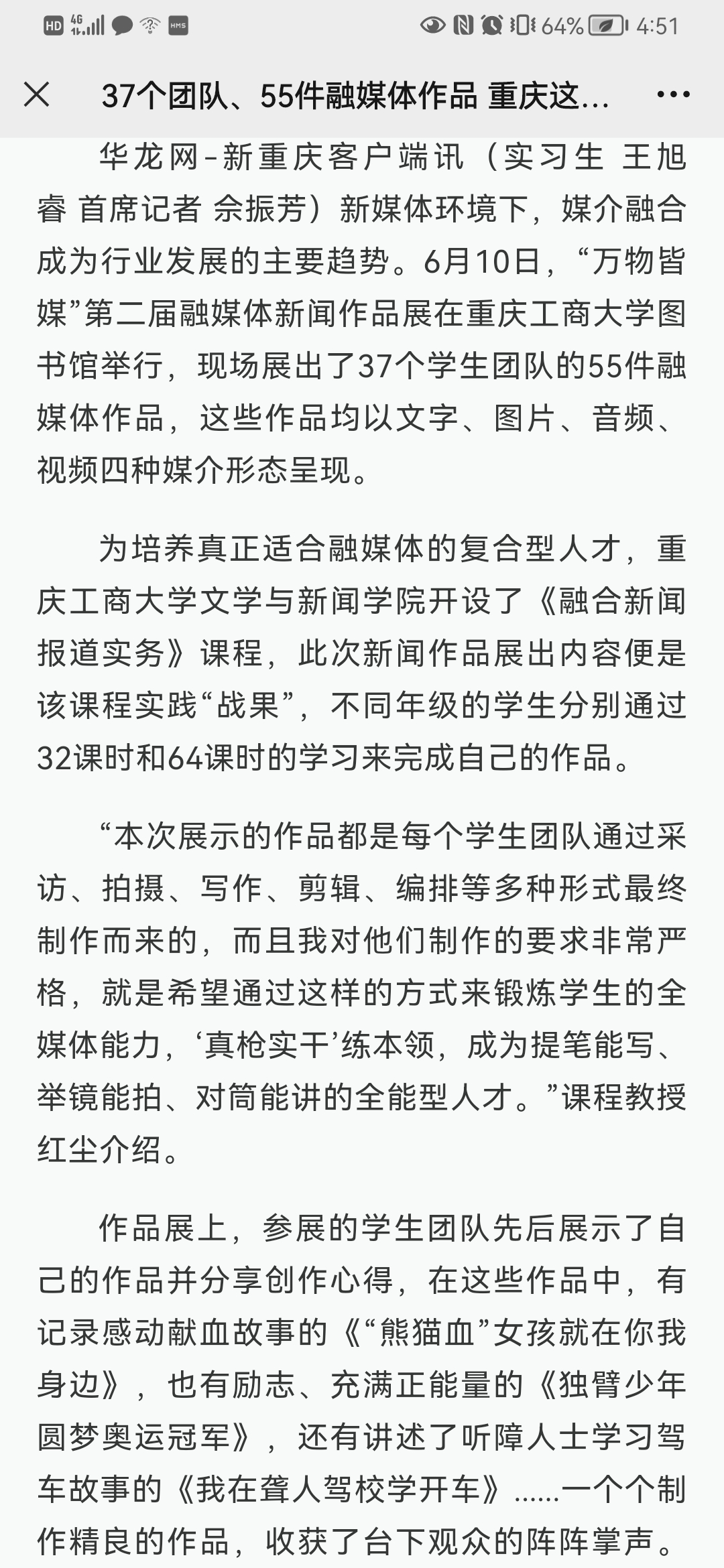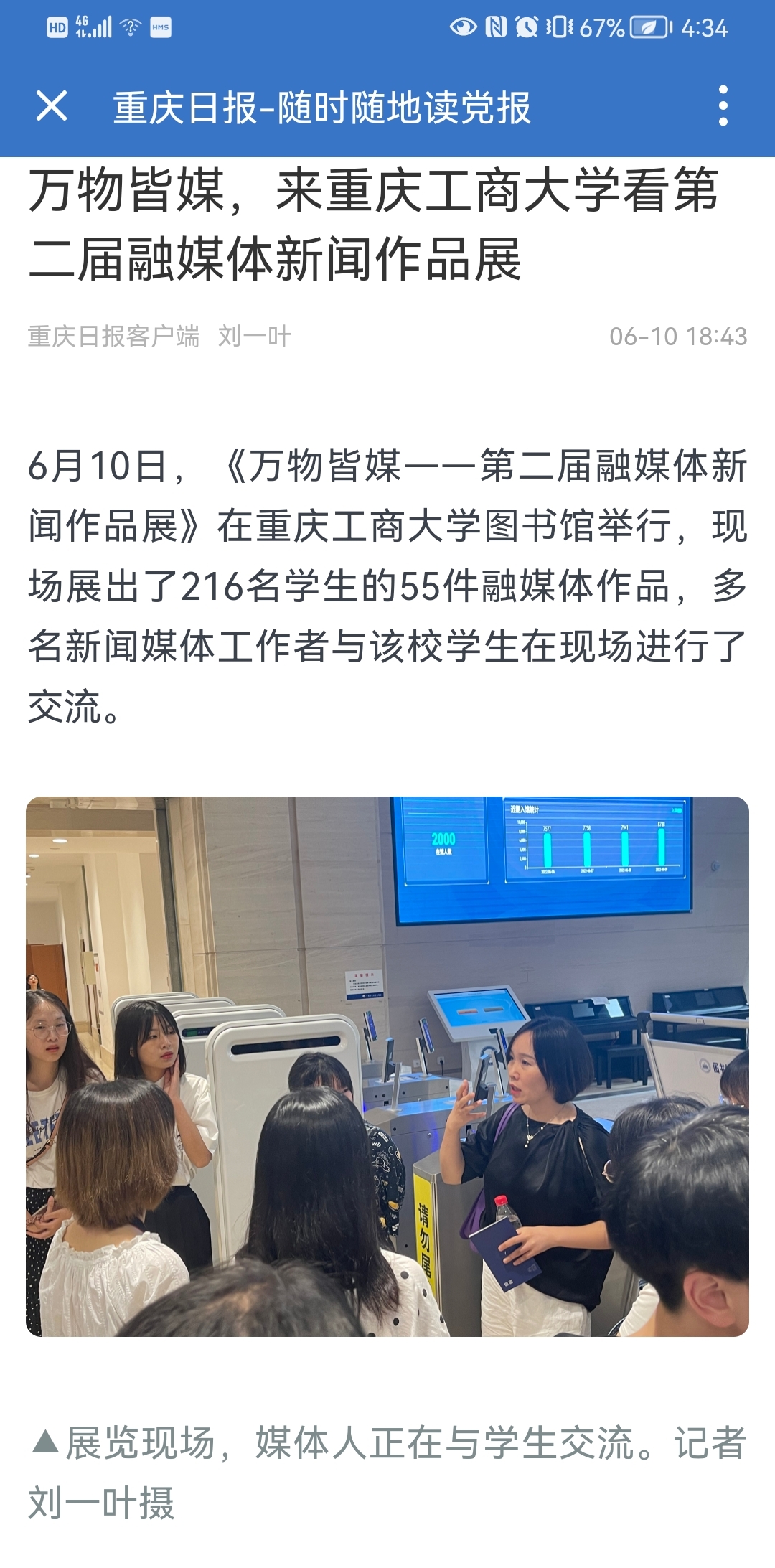 近日,重庆日报、新华网重庆频道等近10家媒体报道我校yl7703永利集团万物皆媒·第二届融媒体新闻作品展。6月10日,重庆日报以“万物皆媒,来重庆工商大学看第二届融媒体新闻作品展”为题报道我校yl7703永利集团万物皆媒·第二届融媒体新闻作品展。6月10日,华龙网-新重庆客户端以“37个团队、55件融媒体作品 重庆这所高校让学生“真枪实干”练本领”为题报道我校yl7703永利集团万物皆媒·第二届融媒体新闻作品展。6月10日,新华网以“实战实干练全媒体技能,重庆工商大学展出55件融媒体作品”为题报道我校yl7703永利集团万物皆媒·第二届融媒体新闻作品展。 6月10日,上游新闻以“万物互媒—第二届融媒体新闻作品展,55件作品展示当代大学生创作实力”为题报道我校yl7703永利集团万物皆媒·第二届融媒体新闻作品展。6月10日,今日头条、网易、澎湃新闻、新浪新闻等媒体均以“实战实干练全媒体技能,重庆工商大学展出55件融媒体作品”为题进行转载报道。