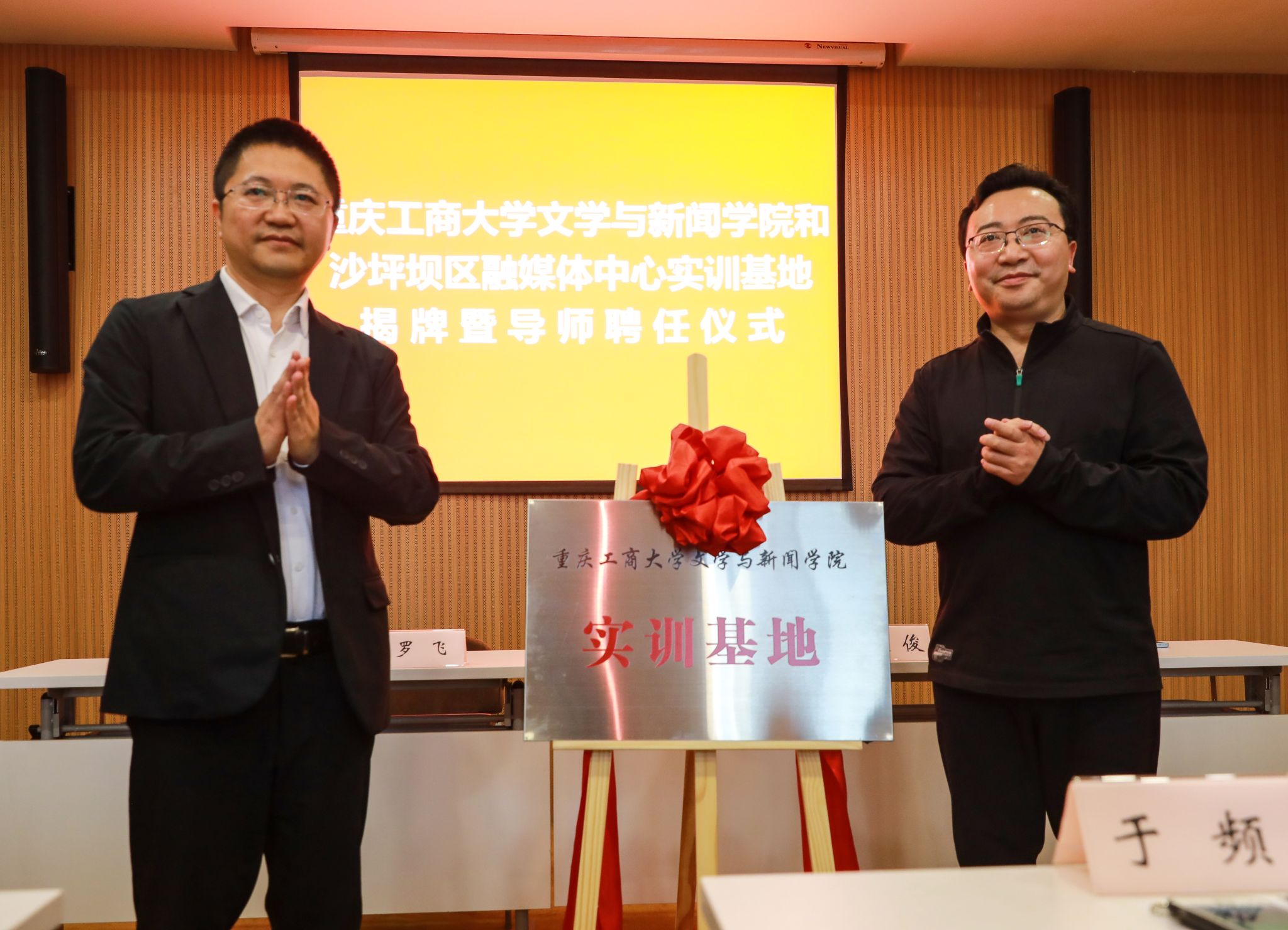 4月10日,yl7703永利集团和沙坪坝区融媒体中心举行实训基地揭牌暨导师聘任仪式。yl7703永利集团党委书记于频、院长殷俊、副书记程元元、副院长郑笑眉、新闻系系主任廖宇翃,沙坪坝区融媒体中心主任罗飞、副书记肖寒、副主任黄伟、冯剑、王小生等出席了揭牌仪式。