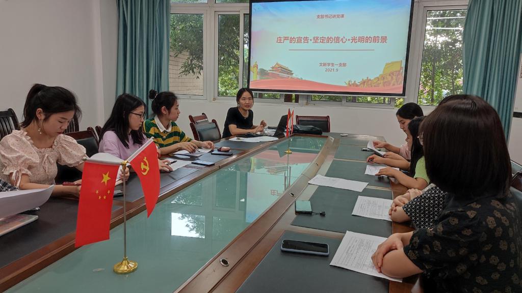 为深入学习贯彻习近平总书记“七一”重要讲话精神,9月29日,文新学生一支部在慧智楼90528会议室开展支部书记讲党课活动。支部书记张小焕老师为学生党员讲授了主题为《庄严的宣告·坚定的信心·光明的前景》的专题党课。