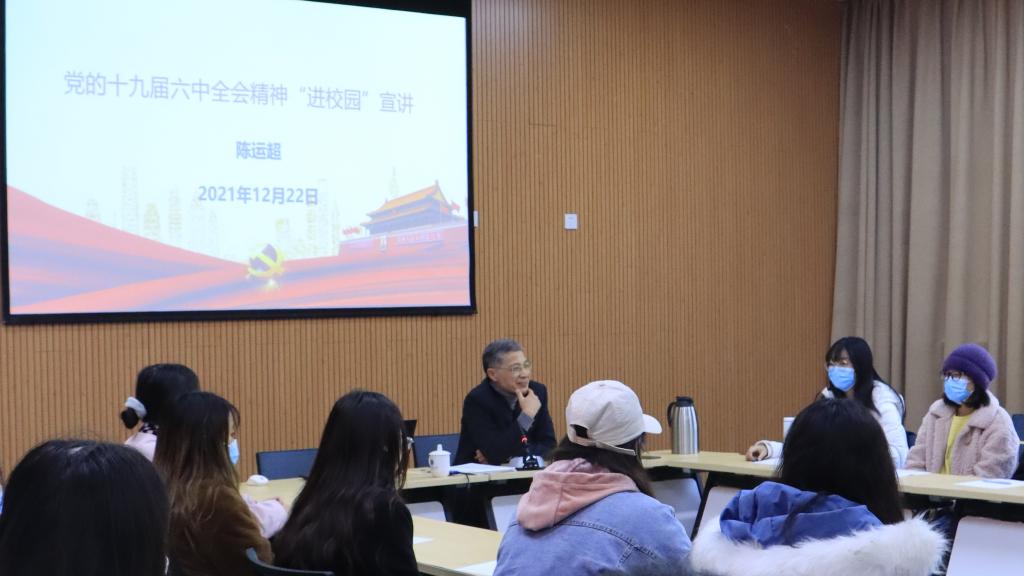 最后,陈运超副校长寄语在座同学要认真领悟党的十九届六中全会精神的内涵,洞察历史规律,掌握历史主动,与民族同在同存,在时代潮流中把握机遇,在发展中彰显自我价值。同学们听完之后,纷纷表示将从十九届六中全会精神和党百年奋斗积累的宝贵历史经验中汲取智慧,学好专业知识,增强自身本领,为实现中华民族伟大复兴的中国梦贡献青春力量。
